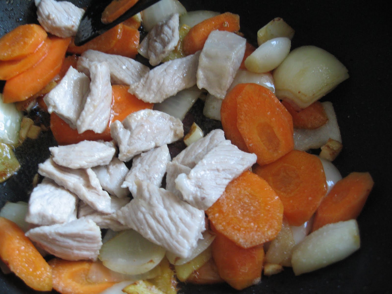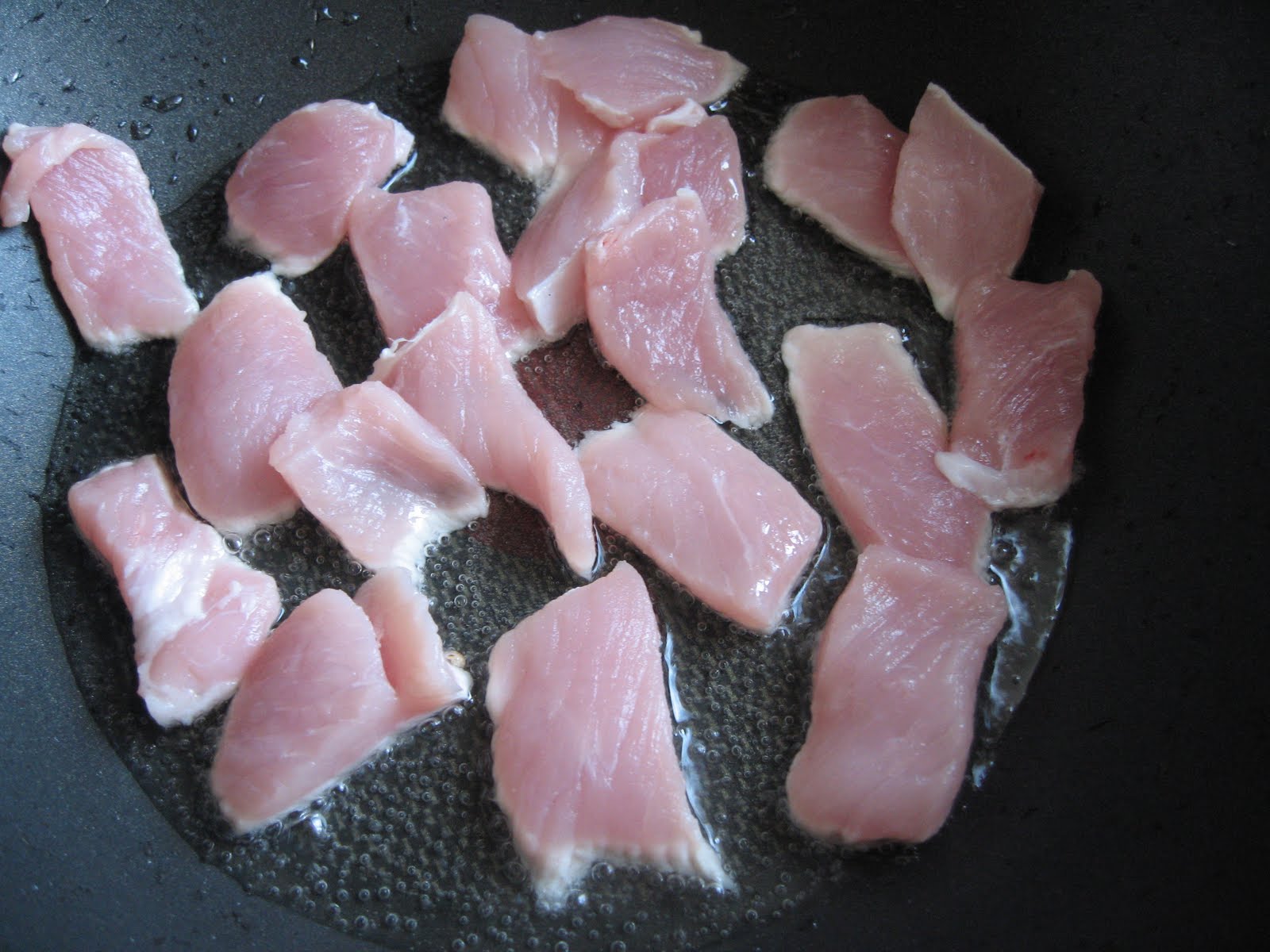 carnea de porc se prajeste pe o parte si pe cealalta, apoi se scoate si se pune deoparte