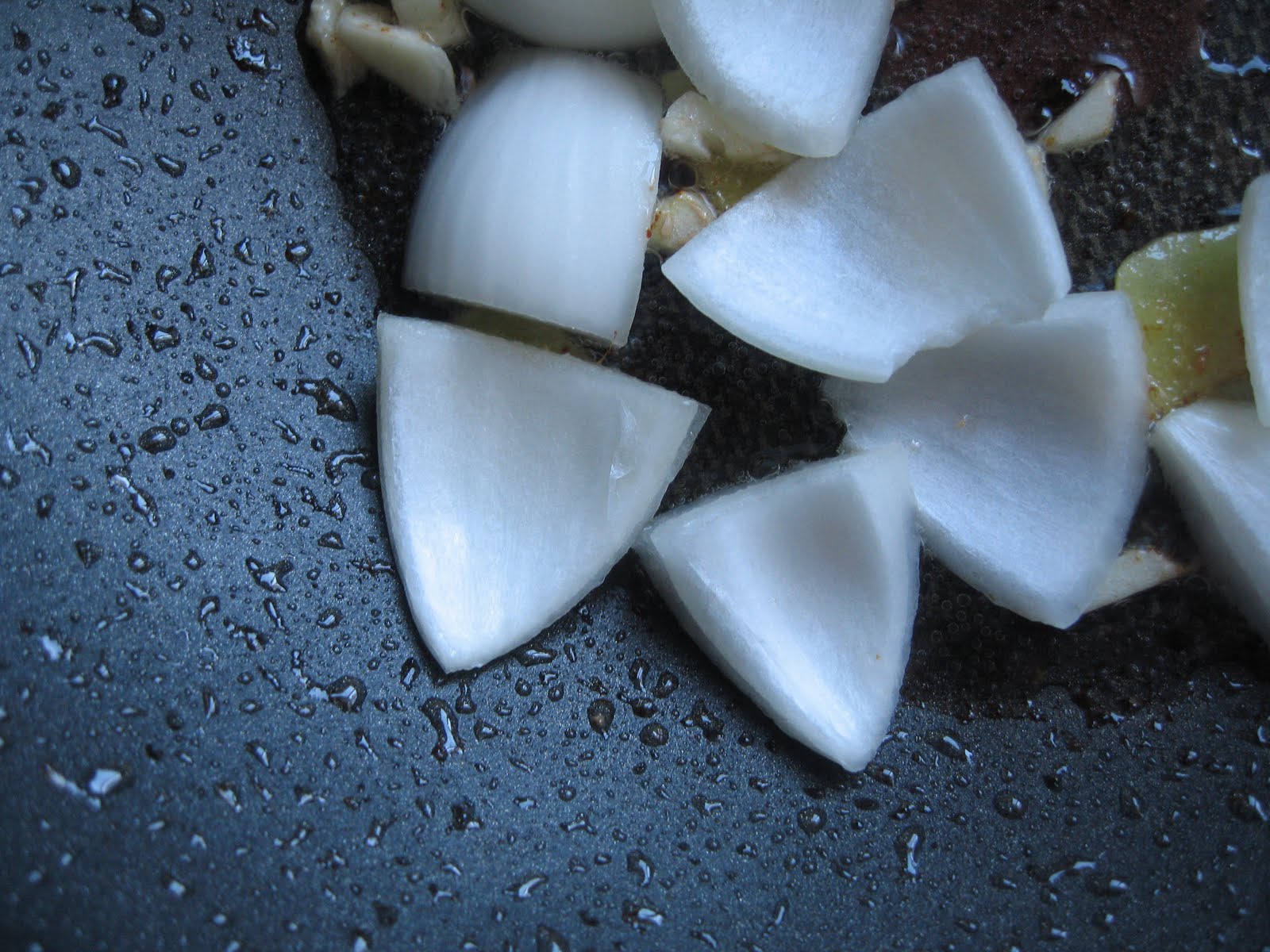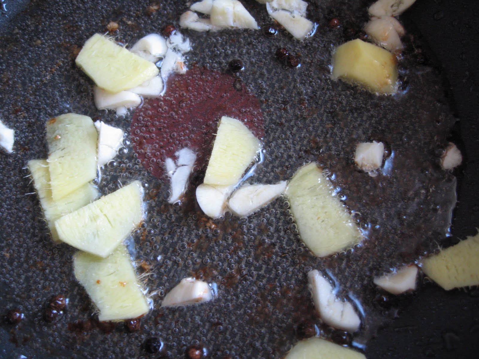In aceeasi tigaie se adauga cealalta lingurita de ulei si boabele de piper, se lasa cateva secunde pana ce aromatizeaza uleiul dupa care se adauga usturoiul zdrobit si ghimbirul taiat feliute