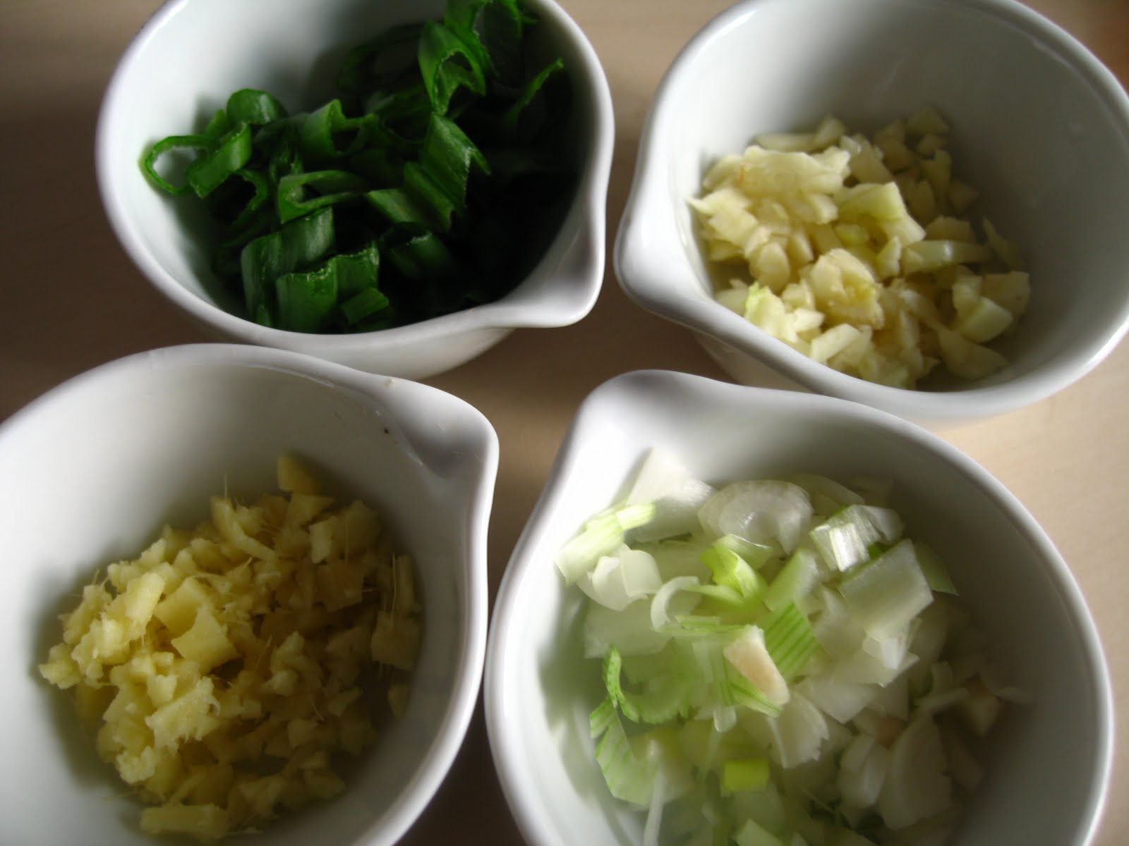 carnea tocata se pune intr-un castron si peste ea se adauga sarea , 1 lingurita de sos de soia, otetul de orez, 1 lingurita de ulei de susan si amidonul; se amesteca bine si se lasa la frigider 20 de minute.