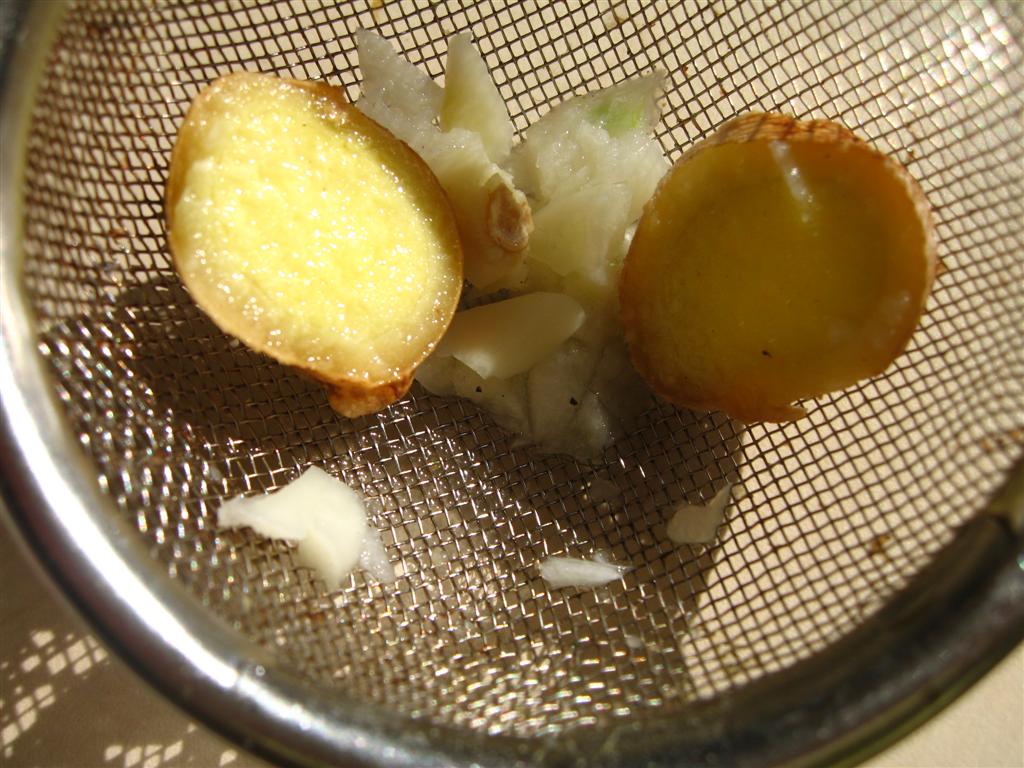 punem usturoiul si ghimbirul in oala si lasam sa dea supa in clocot, intre timp aromele de ghimbir si usturoi s-au “imprietenit” :), e timpul sa le scoatem din dupa pentru a nu da gust amar. (daca doriti ca supa sa aiba gust mai puternic, mai lasati cateva minute usturoiul si ghimbirul)