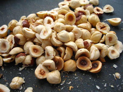 alunele de padure le-am prajit in cuptor si le-am taiat pe jumatate (va sfatuiesc sa le taiati chiar mai mici caci veti avea probleme la taiatul patratelelor la final)