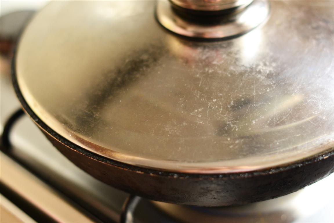 punem tigaia pe focul FOARTE mic, dupa care acoperim tigaia cu un capac. Suprafata de jos a discului de aluat se va praji usor, iar datorita capacului vom obtine vapori ce vor ajuta aluatul sa creasca.