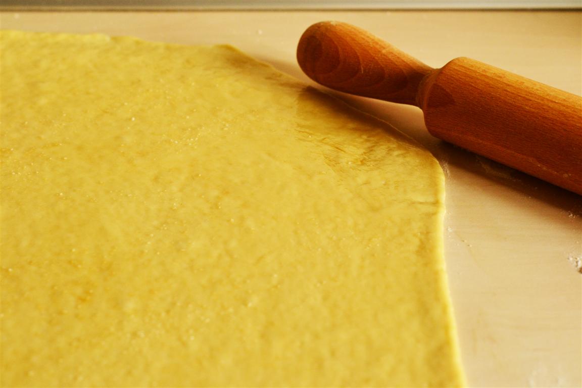 intindem biluta de aluat intr-un dreptunghi cu lungimea de 40 de cm, iar latimea de 20 de cm. Intindeti aluatul cu sucitorul fara grija, aluatul este elastic si nu se rupe. La mine dreptunghiul nu prea a iesit drept, dar a fost ok pana la urma 🙂