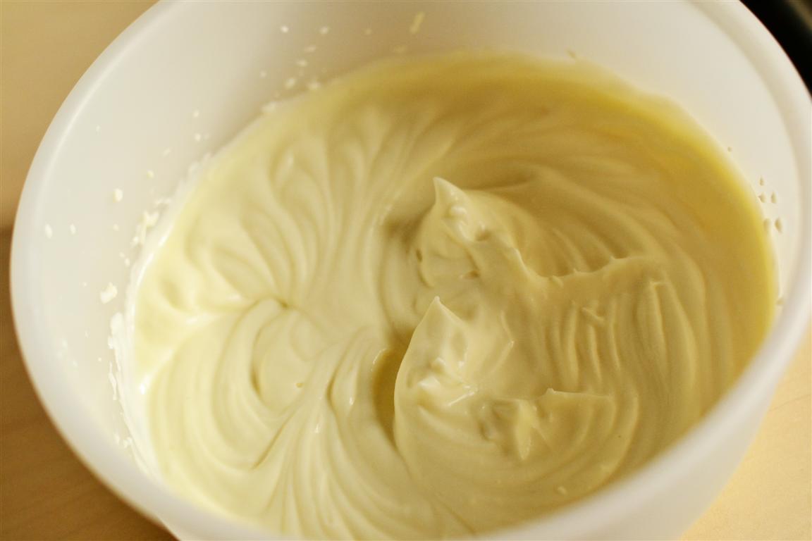 repunem pe foc ibricul cu frisca si topim ciocolata alba. Lasam sa se raceasca complet