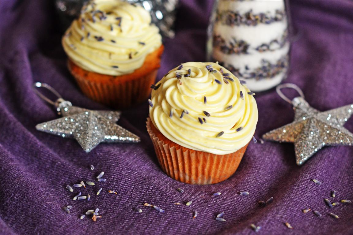 pentru un touch final pudram cu zahar cupcake-ul si presaram cateva floricele de levantica