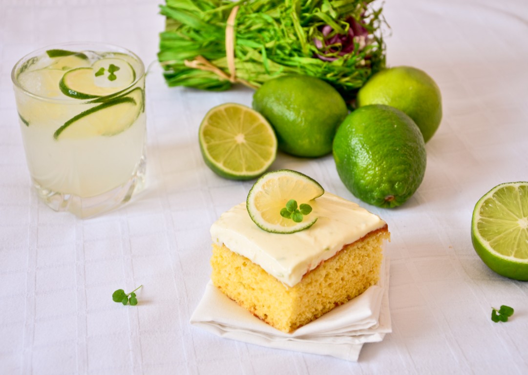 lăsați blatul în tavă pentru 15 minute să se răcorească, după care îl scoateți pe un grătar să se răcească complet.  Între timp pregătiți siropul: într-o oală turnați apa împreună cu zahărul și lăsați să fiarbă până se formează un sirop mai gros. Lăsați siropul să se răcească. Radeți lămâile verzi, stoarceți sucul lor și adăugați sucul și coaja de lime la siropul de zahăr. Înțepați blatul din loc în loc cu furculița și însiropați blatul cu ajutorul unei pensule de bucatărie. Lăsați blatul deoparte să se îmbibe cu sirop.