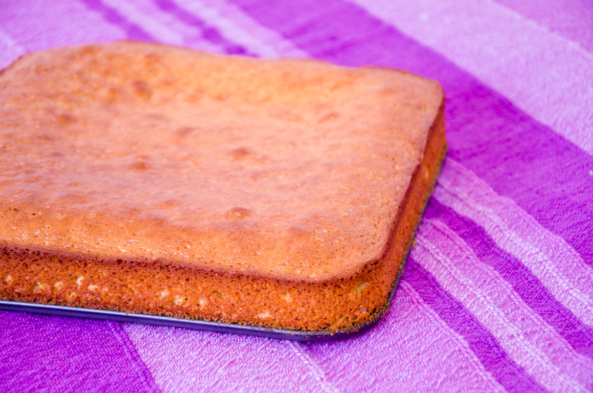 ca sa nu aveți surprize să se ardă pe lături prăjitura, puteți să înveliți tava în foaie de staniol. Dați prăjitura la cuptorul încins pentru 35-40 de minute. Faceți testul cu scobitoarea. Veți obține un blat nu foarte înalt, cam de 4-5 cm