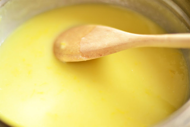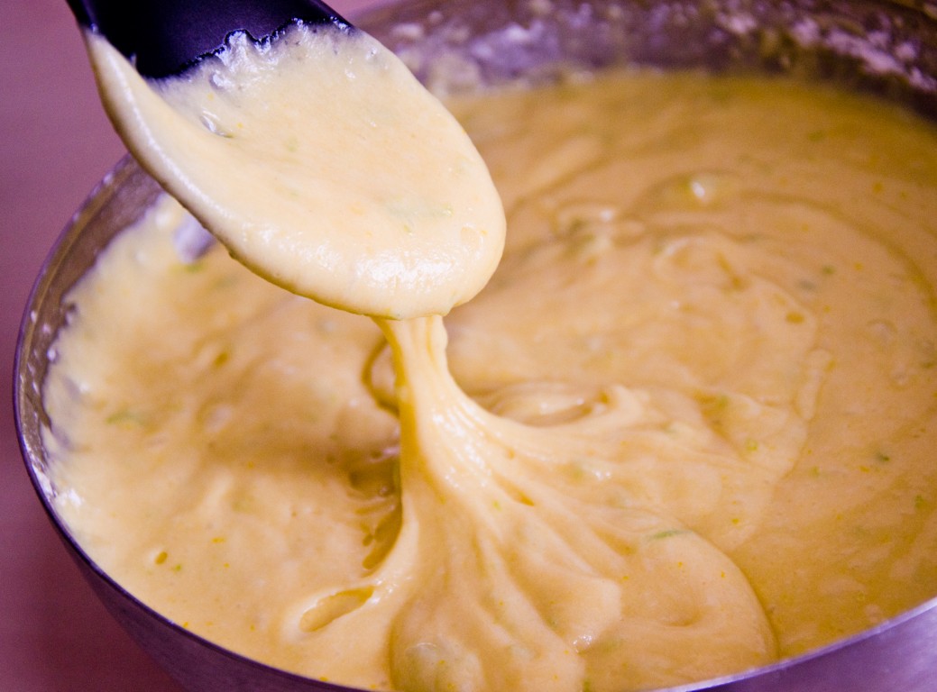 înglobați iaurtul si untul topit și amestecați din nou. Turnați sucul de lămâie și adăugați și coaja de lămâie. Amestecați