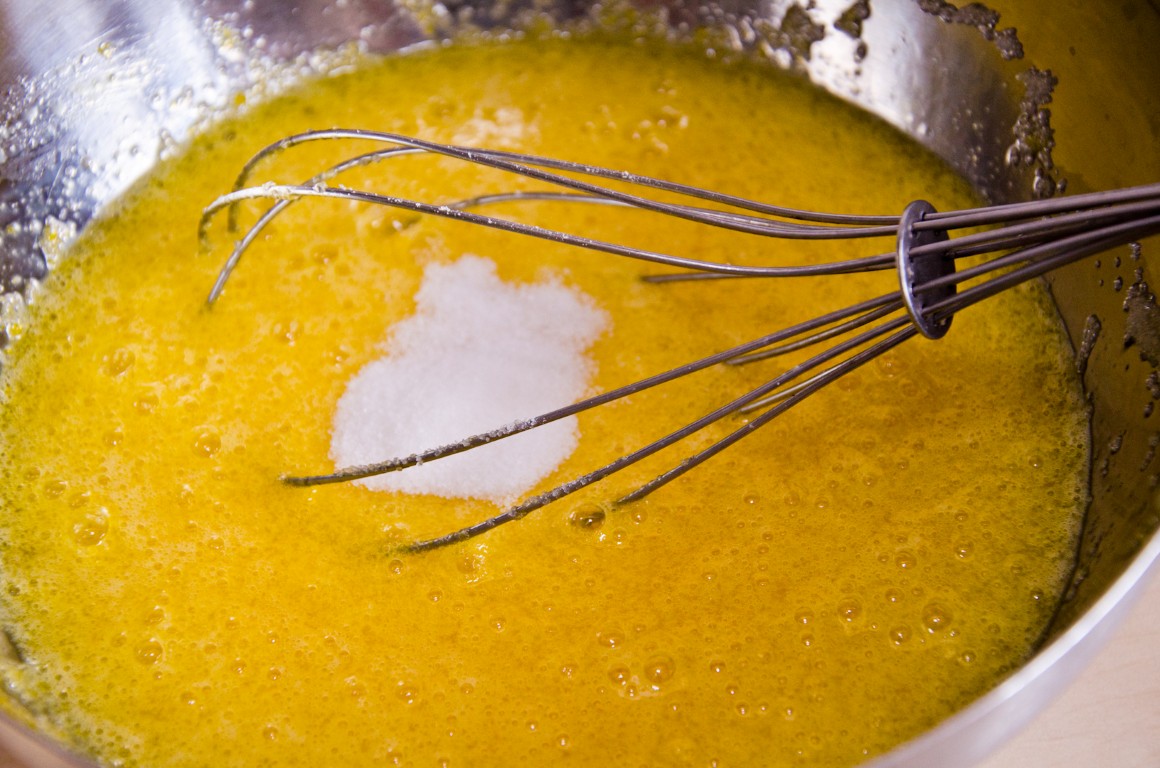 intr-un castron bateti ouăle împreună cu zahărul și zahărul vanilat pana ce își dublează volumul