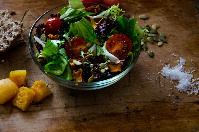 Spalati salata si rupeti frunzele bucati mari (sau apelati la varianta rapida, salata asortata la punga 🙂 ). Taiati  in doua rosiile cherry.