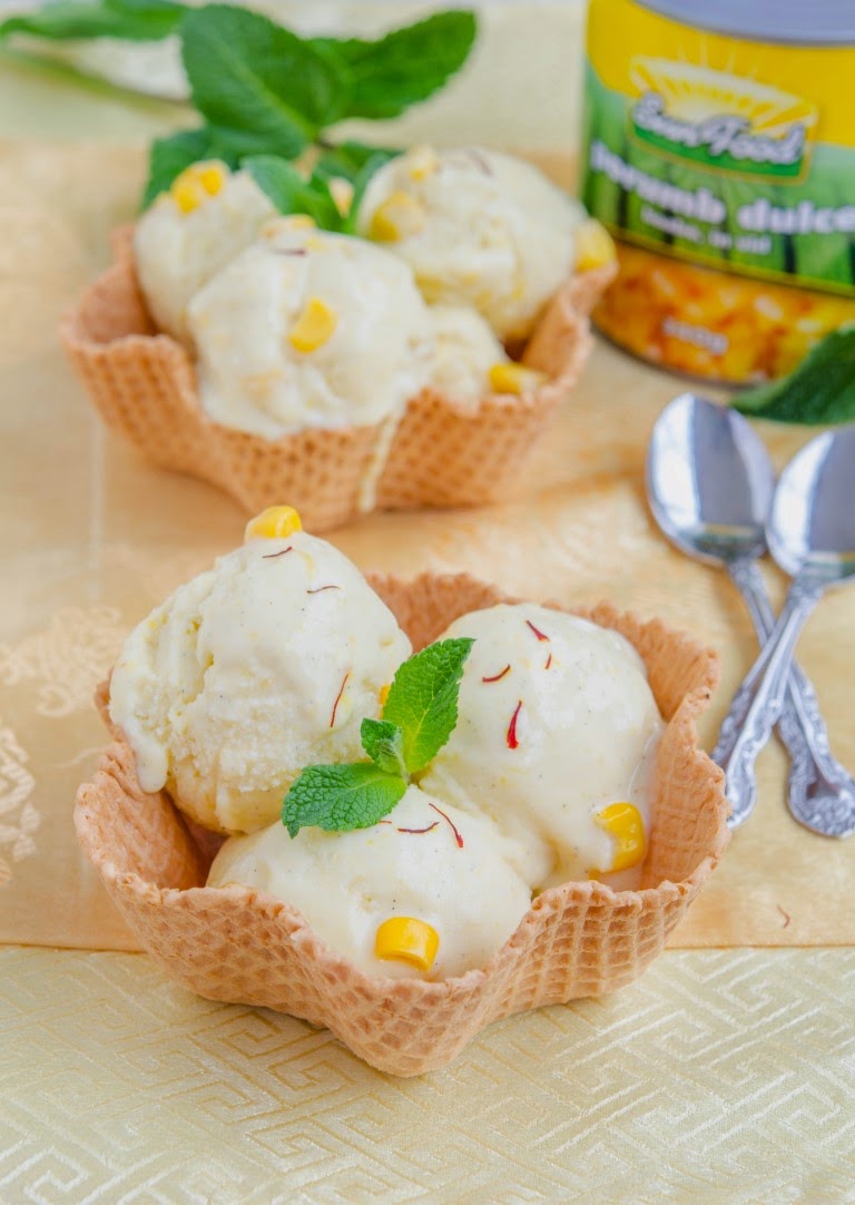 Intr-un bol turnati laptele indulcit condensat impreuna cu frisca lichida si mixati foarte bine pana obtineti o crema pufoasa. Adaugati pasta de porumb si sofran si amestecati din nou foarte bine. Turnati compozitia obtinuta intr-o tavita  sau intr-un recipient de sticla, inveliti intr-o folie alimentara si dati la congelator pentru 5-6 ore sau cel mai bine peste noapte.