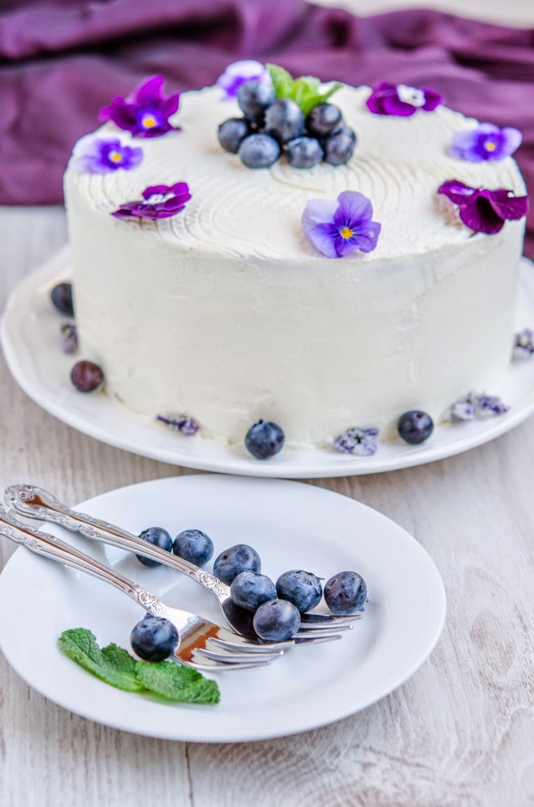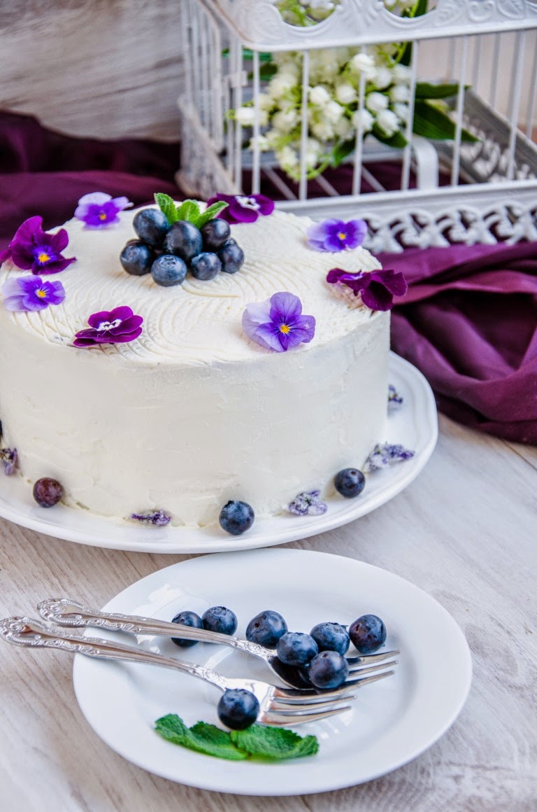Scoateti tortul de la frigider, Pregatiti frisca: intr-un bol mixati foarte bine smantana lichida pentru frisca impreuna cu mascarpone si zaharul vanilat. Imbracati tortul cu compozitia obtinuta si ornati dupa cum doriti :). Dupa cum va ziceam, eu am optat pentru afine proaspete, menta si panselute comestibile proaspete