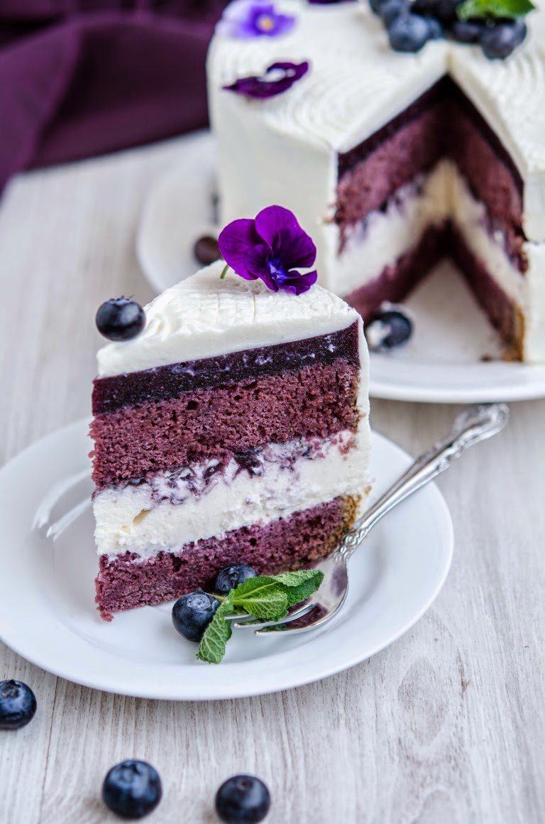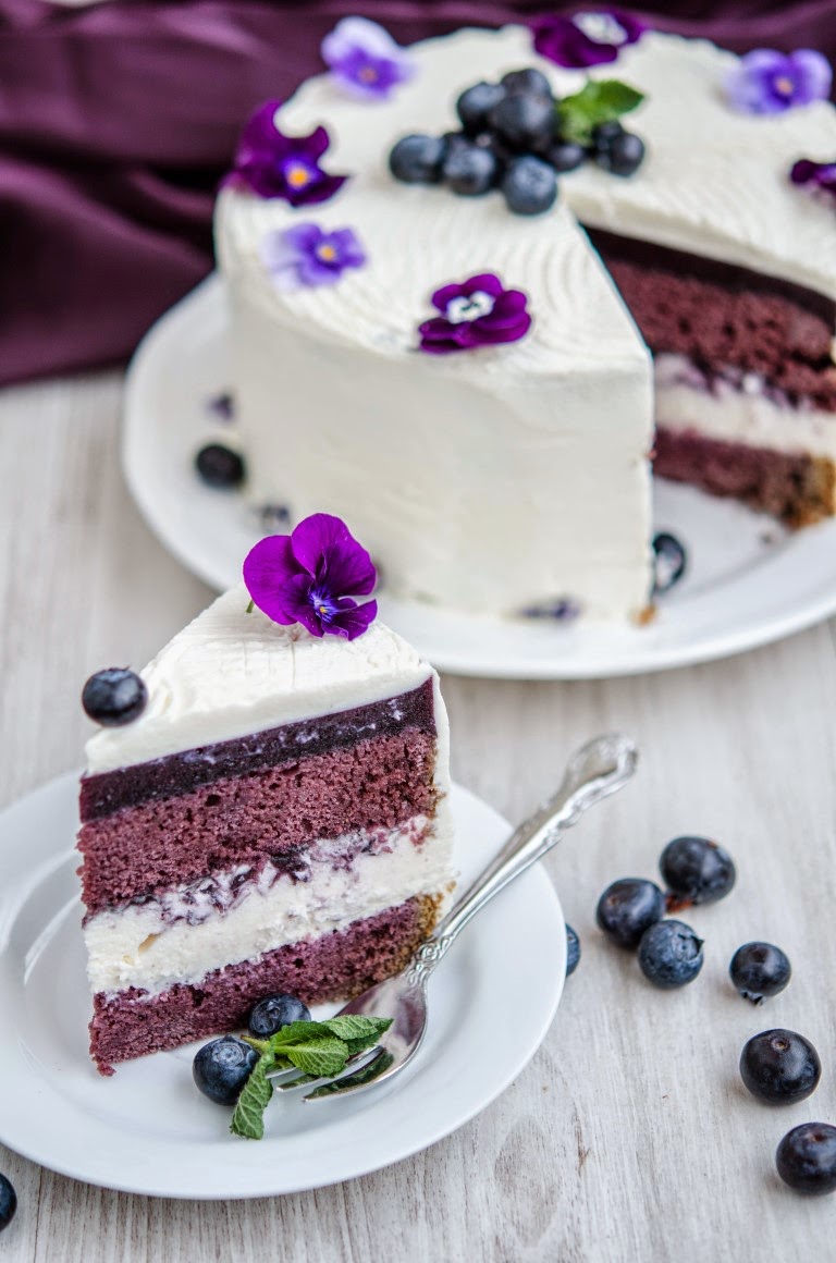 Si daca tot suntem la ceas de sarbatoare :), nu am venit cu mana goala, am pregatit pentru fiecare dintre voi o feliuta din tortul special creat pentru blog :). Nu sunt la prima tentativa de a folosi violete intr-un desert, reteta ati mai vazut-o si cand am pregatit Tortul cu violete de ziua mea. De data aceasta, am pus si niste afine, insa nu am mai folosit bomboanele de violete. Pe deasupra am pus panselute comestibile ca sa-i dea un aspect si mai proaspat, iar pe margini am pus cateva violete zaharisite.