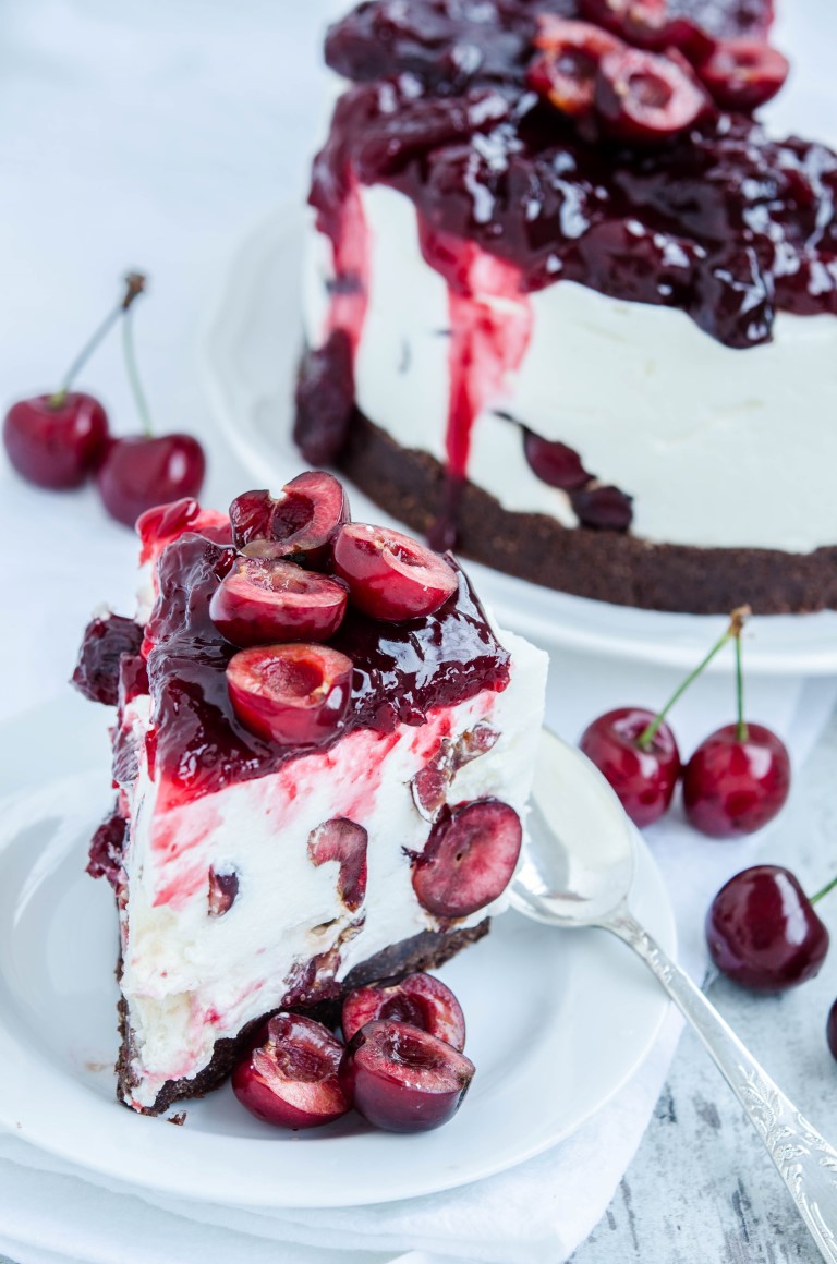 Separat, mixati frisca lichida pana obtineti o frisca pufoasa, incorporati in crema de branza. Turnati o parte de compozitie peste blatul de biscuiti, adaugati din loc in loc o parte din ciresele taiate jumatati, puneti si restul de crema de branza, si din nou cirese taiate bucati.