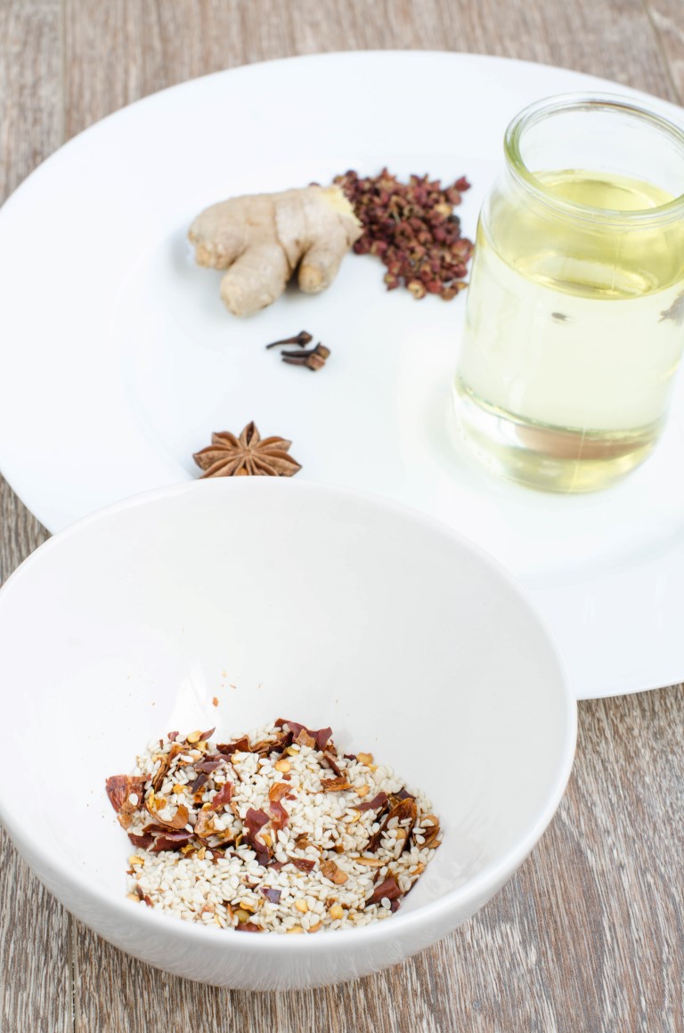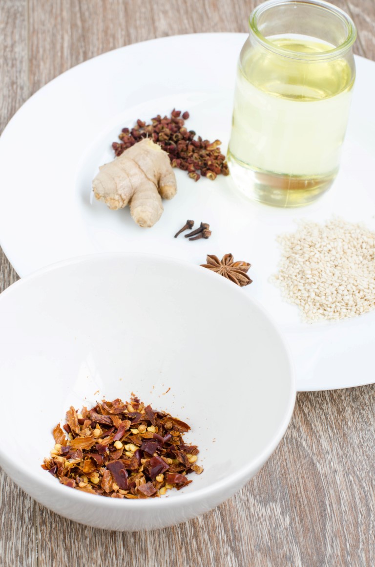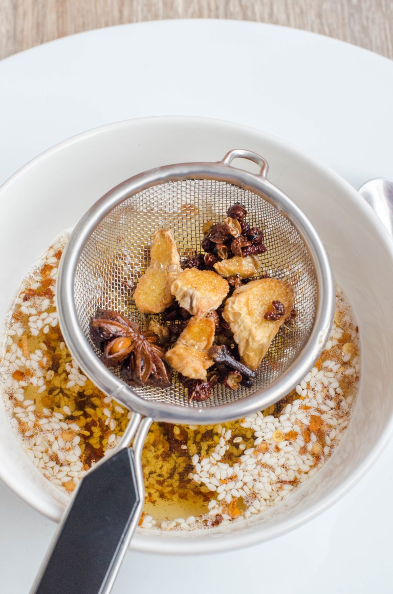 intr-un ibric incingem uleiul de arahide, adaugam ghimbirul, piperul Sichuan, cuisoarele si anasonul, dam focul mic si  lasam 2 minute toate condimentele sa se prajeasca incet. Este de preferat sa folosim ulei de arahide, deoarece acesta suporta un grad inalt de temperatura si nu se arde la fel de repede precum alte uleiuri in timpul prajirii alimentelor.