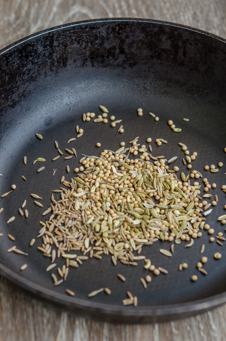 Intr-o tigaita incalziti bine boabele de mustar, chimionul si semintele de fenicul pana ce capata o aroma placuta. Rasniti-le pana ce devin o pudra fna.