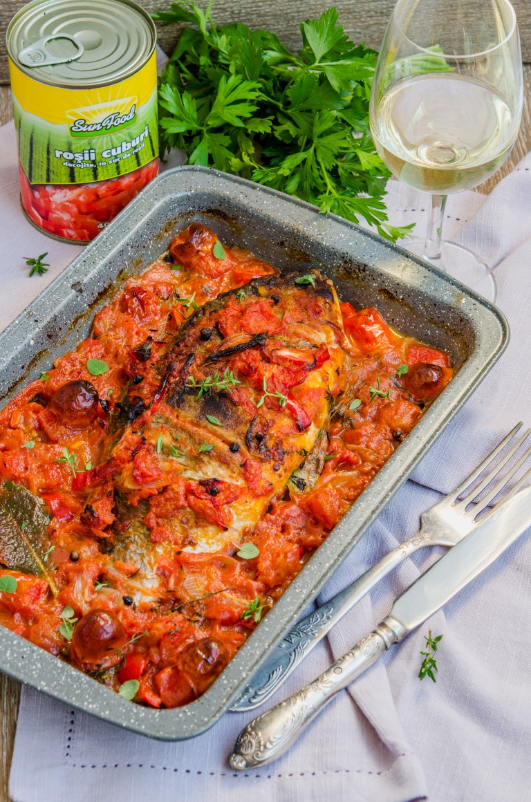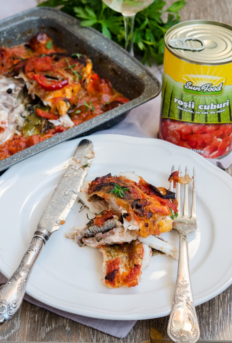 Dorada la cuptor preparata in acest mod iese minunata, si tare aromata, mai ales ca este preparata in sos de rosii decojite de la prietenii mei de la SunFood!.