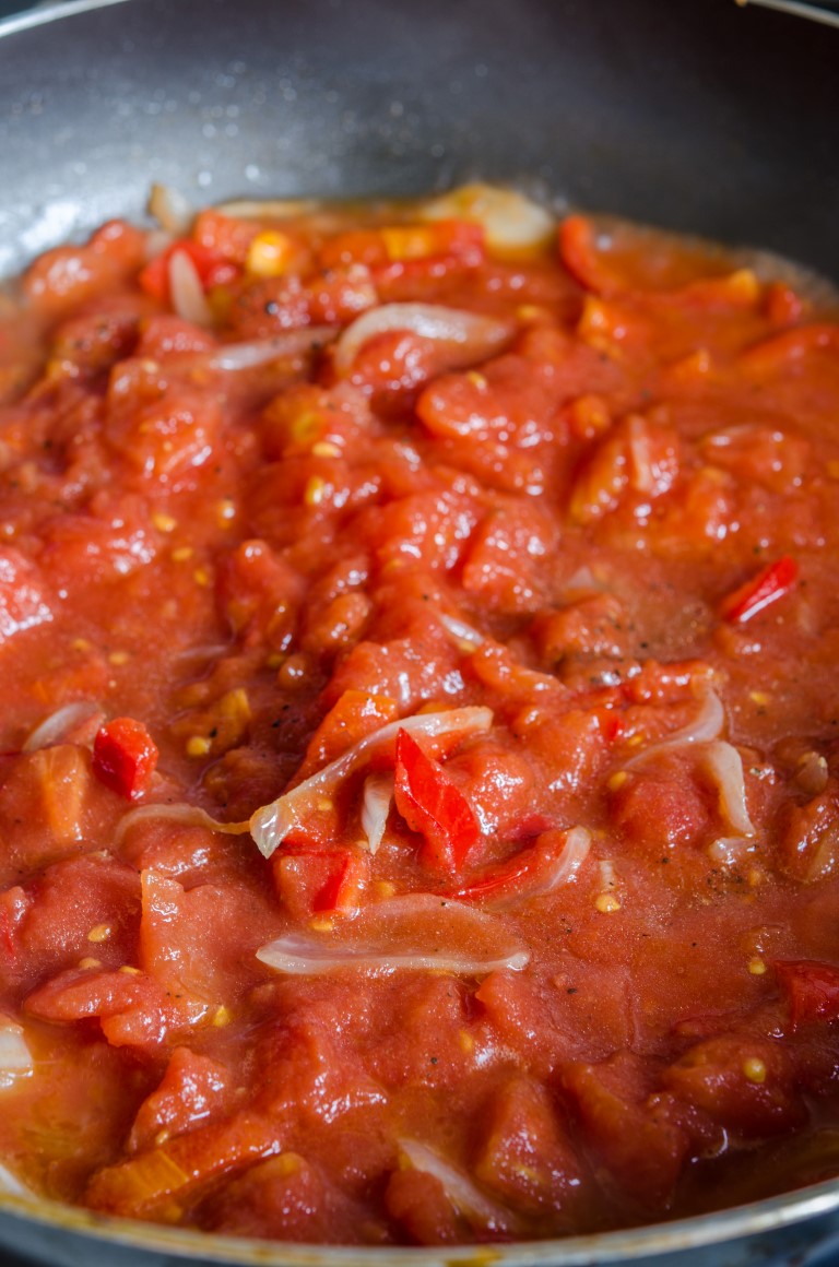 Desfaceti conserva de rosii cuburi si puneti continutul ei in tigaie impreuna cu vinul.