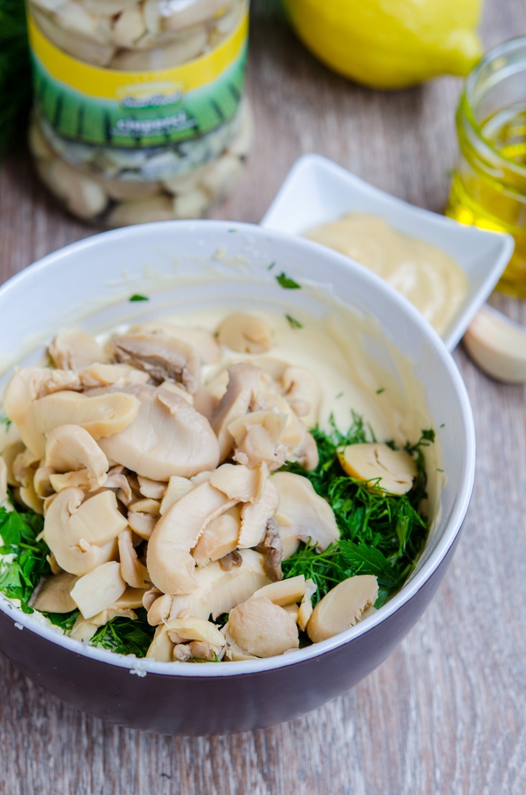 In amintirea acelor zile de liceu, am pregatit aceasta salata de ciuperci, dar mai usoara si mai delicata, adaugand iaurt, si mai putina maioneza.
