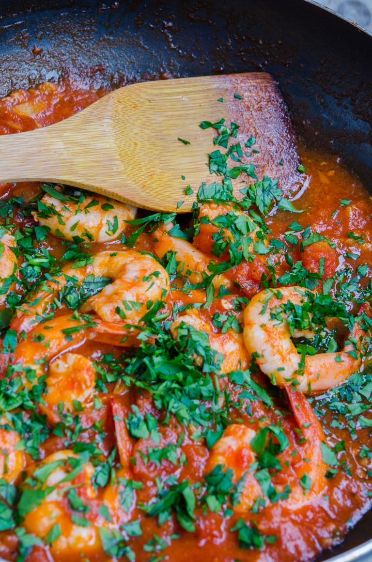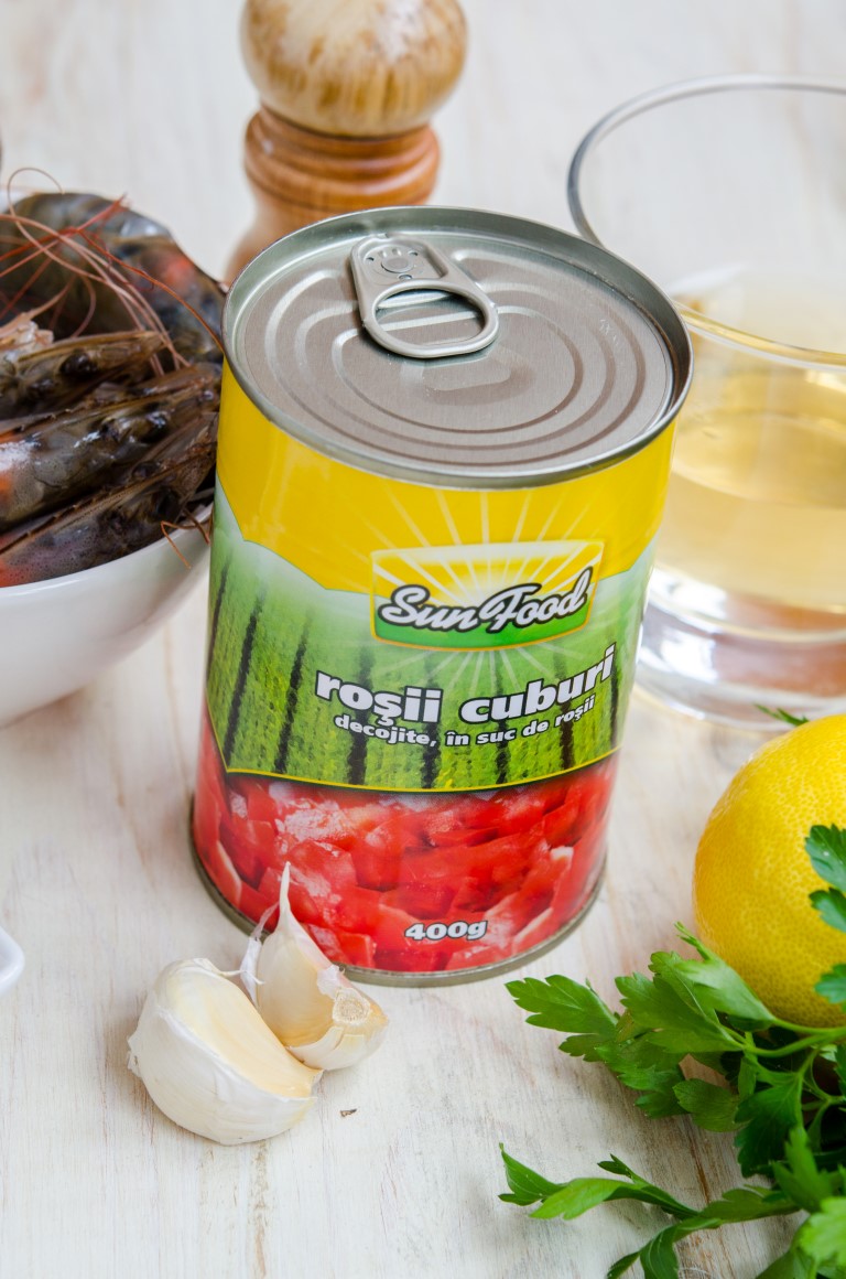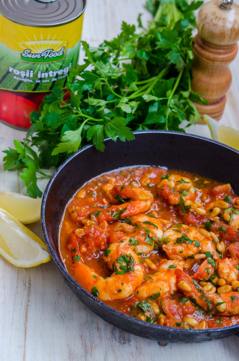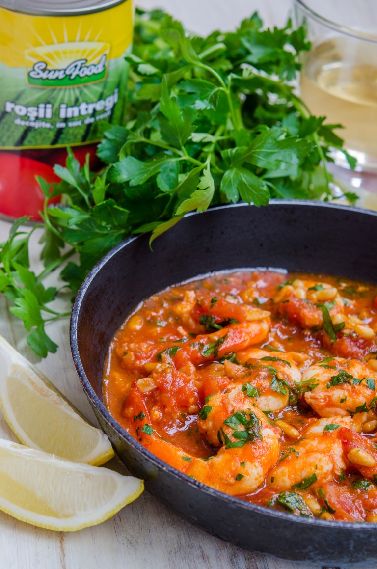 Vara imi place sa prepar crevetii la gratar sau pusi pe frigarui cu bucati de lamaie. In zilele mai friguroase prefer crevetii trasi la tigaie cu putin unt, lamaie si mult patrunjel. Mai nou, prefer crevetii in sos de rosii ca sa-mi aduca aminte de vara. Pentru ca acum pe piata, desi se gasesc rosii, savoarea lor este departe de a fi cea de vara, asa ca apelez mereu cu incredere la conservele de rosii de la SunFood. Sunt atat de bune si de aromate incat ma duc cu gandul instantaneu la vara!