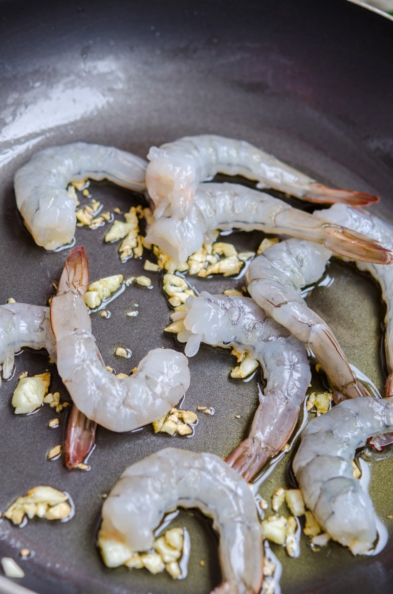 Pentru inceput, pregatim crevetii. Ii curatam de cap si de crusta, lasand doar o mica parte din coada. Tragem de firul (intestinul subtire) dinspre “sira spinarii” si il indepartam.