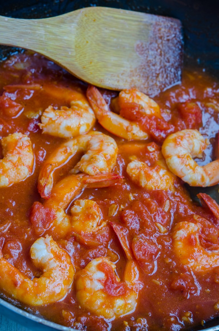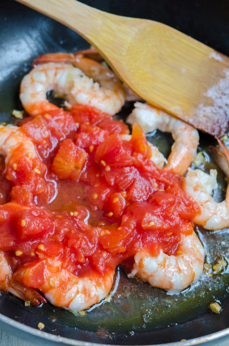 Desfacem conserva de rosii decojite si o turnam peste crevetii din tigaie