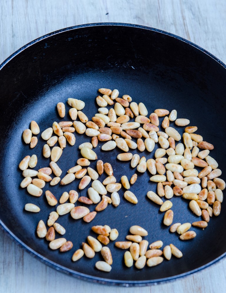 Intre timp, intr-o tigaie mica prajim fara adaos de ulei semintele de pin.