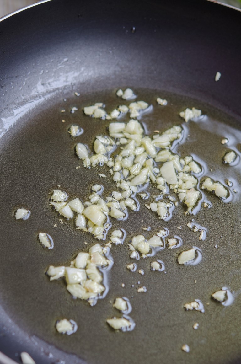 Intr-o tigaie incingem uleiul de masline, tocam cateii de usturoi si ii sotam cateva secunde, avand grija sa nu se arda.