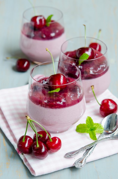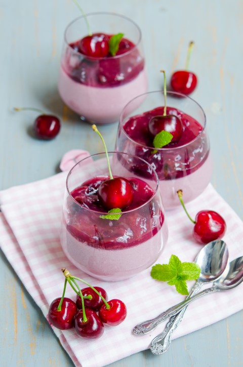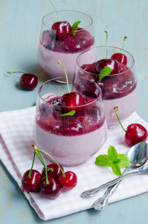 In momentul servirii scoateti panna cotta de la frigider, puneti in fiecare pahar cate 2 linguri din compozitia de cirese pastrata, garnisiti cu cirese si menta proaspata.