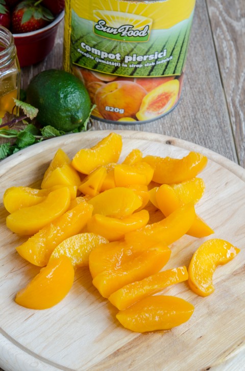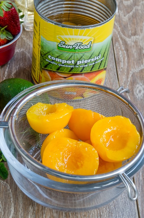 Pentru inceput puneti piersicile intr-o sita si lasati-le sa se scurga bine de sirop.