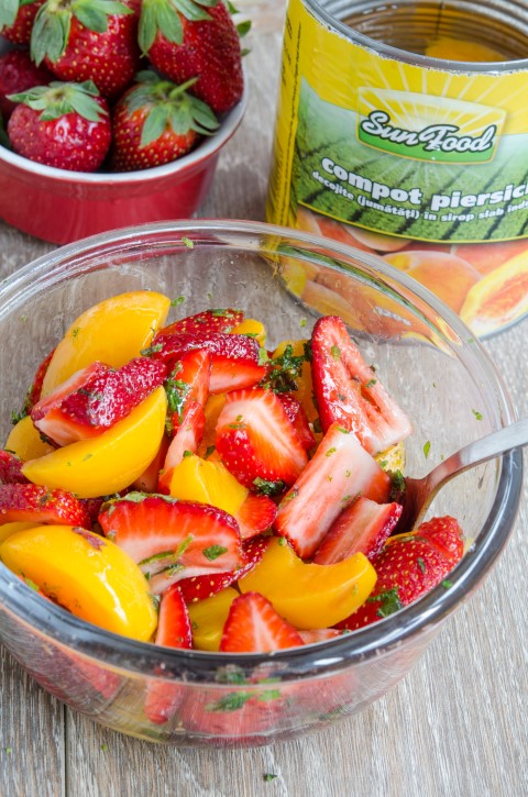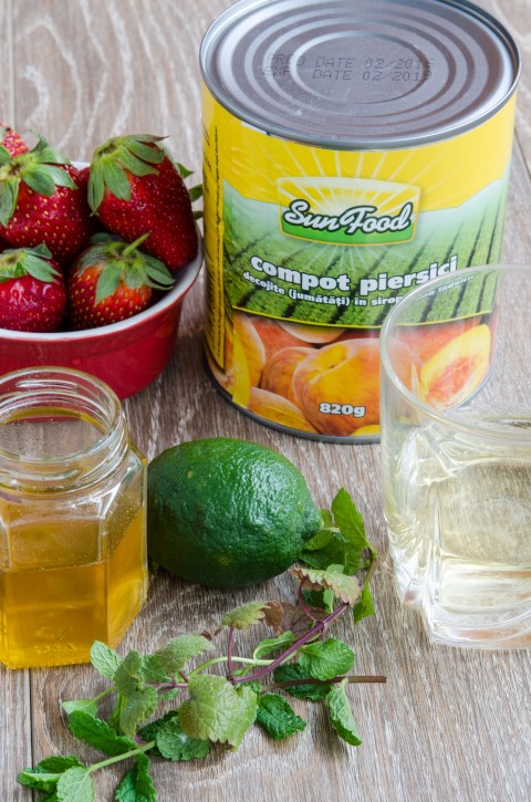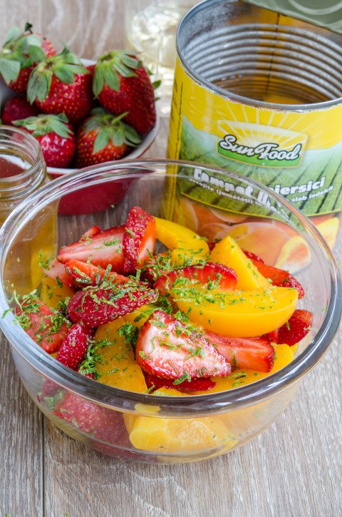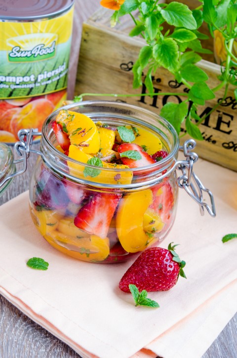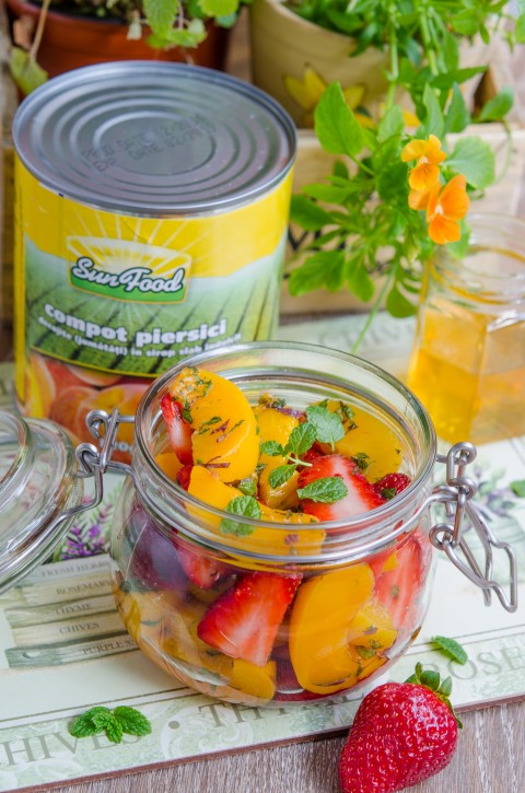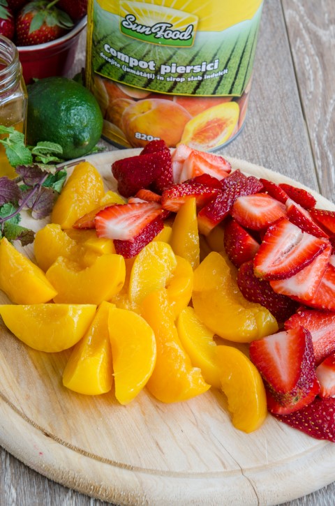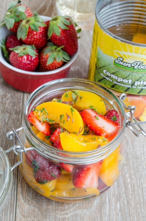 Dupa prognoza meteo a zilelor urmatoare, nadajduiesc ca vara incepe sa-si faca aparitia. Nu se stie ce surprize ne mai ofera vremea, dar ar cam fi cazul sa isi faca treaba bine si sa ne aduca soare cald de vara, zile senine si cu vacanta :). Dar pana la vacanta mai e ceva timp, asa ca imi mai sting dorul cu cate o salata de fructe usoara si delicioasa! Salata asta se poate lua la picnic, caci, da, o puteti aseza intr-un borcan, sau o puteti servi intr-o zi torida de vara. Despre luat a doua zi la servici…eh, eu zic sa va mai ganditi un pic la acest aspect :D, pentru ca are un pic de alcool, de fapt, putin, foarte putin vin. Daca nu va deranjeaza gurita aceea de vin din salata, atunci eu zic sa preparati mai des aceasta salata caci o sa va placa la nebunie! Pana apar piersicile acelea dulci si zemoase mai este ceva timp, asa ca intre timp am pregatit salata mea de astazi cu piersicile minunate de la SunFood. Asa bune si crocante sunt piersicile astea, nici nu zici ca sunt din compot! Imi plac la nebunie!