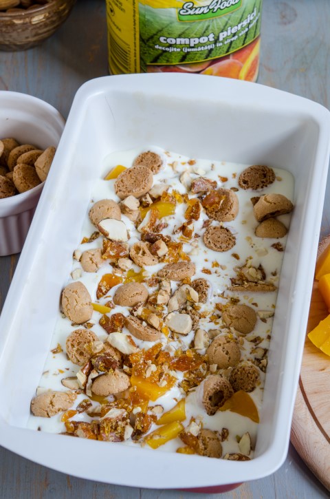Luati un vas de sticla sau o forma de chec sau cozonac, turnati un sfert din compozitia de inghetata, peste presarati piersici tocate, mini biscuiti amaretti si o parte din migdalele pralinate.