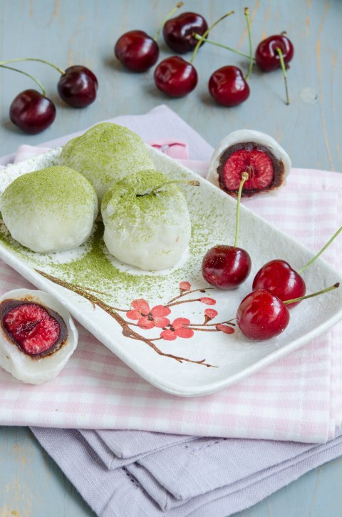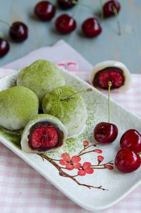 Despre mochi am mai vorbit aici pe blog, sunt mingiute din orez glutinos umplute cu pasta de fasole rosie. De multe ori, mochi sunt umpluti cu fructe, spre exemplu, capsune, denumite ichigo daifuku. Pentru ca la noi capsunele sunt oarecum la final de sezon, iar ciresele in toiul sezonului, m-am gandit ca la acest eveniment special sa pregatesc mochi cu cirese. Ce a iesit…vedeti mai jos :).