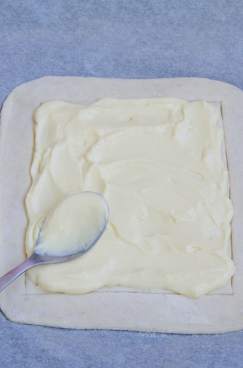 Intindeti o jumatate din cantitatea de crema pe suprafata aluatului, oprindu-va la linia crestata.