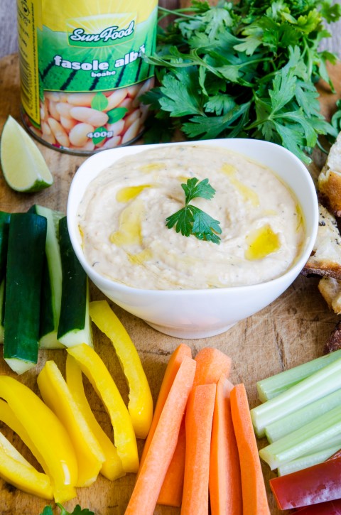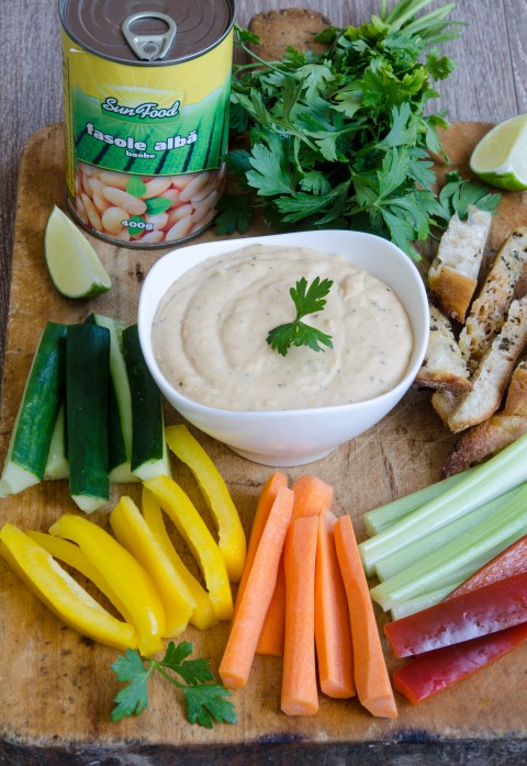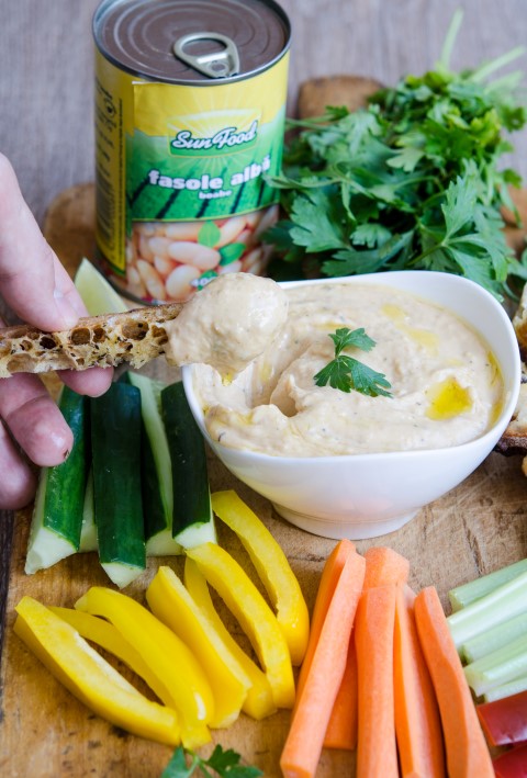 Razele soarelui continua sa ma friga rau zilele astea, astfel incat vremea pentru mine chiar reprezinta un disconfort termic ridicat :)! Cu toate astea sunt constienta ca mai pe la toamna incolo o sa-mi lipseasca zilele astea calduroase, atunci cand voi tremura de frig! :). Dar nu ma plang mult, caci stiu ca asta este anotimpul vacantei, al zilelor lungi si al picnicurilor si iesirilor in parc de dimineata si pana seara! Pe langa salate si smoothie-uri de fructe, atunci cand vreau sa mananc ceva mai consistent, imi prepar repede un hummus cu rosii uscate. Pornind de la aceasta idee, am realizat ca de fapt, pot foarte bine sa folosesc si delicioasa fasole alba de la Sun Food pe care sa o pregatesc imediat, fara a fi preparata termic. La fel, daca doriti, puteti sa-i spuneti fasole batuta, insa nu, nu este! :). Este ceva mai mult de atat, intrucat este mult mai aromata si mai delicioasa! In plus, pentru a mai scadea din calorii in timpul consumului excesiv de pasta de fasole, i-am alaturat niste legume crude si crocante, astfel incat sa am o masa nu doar satioasa, dar si sanatoasa!