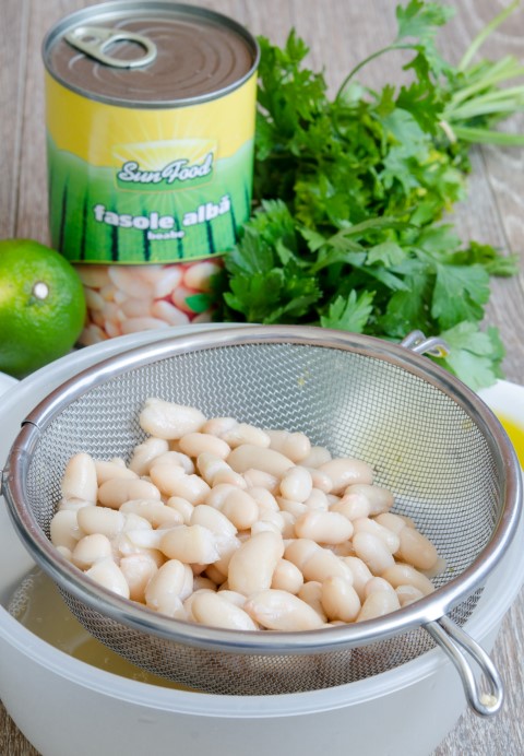 Desfaceti conserva, scurgeti bine fasolea de lichidul in care a stat, pastrati cateva linguri de lichid pentru mai tarziu