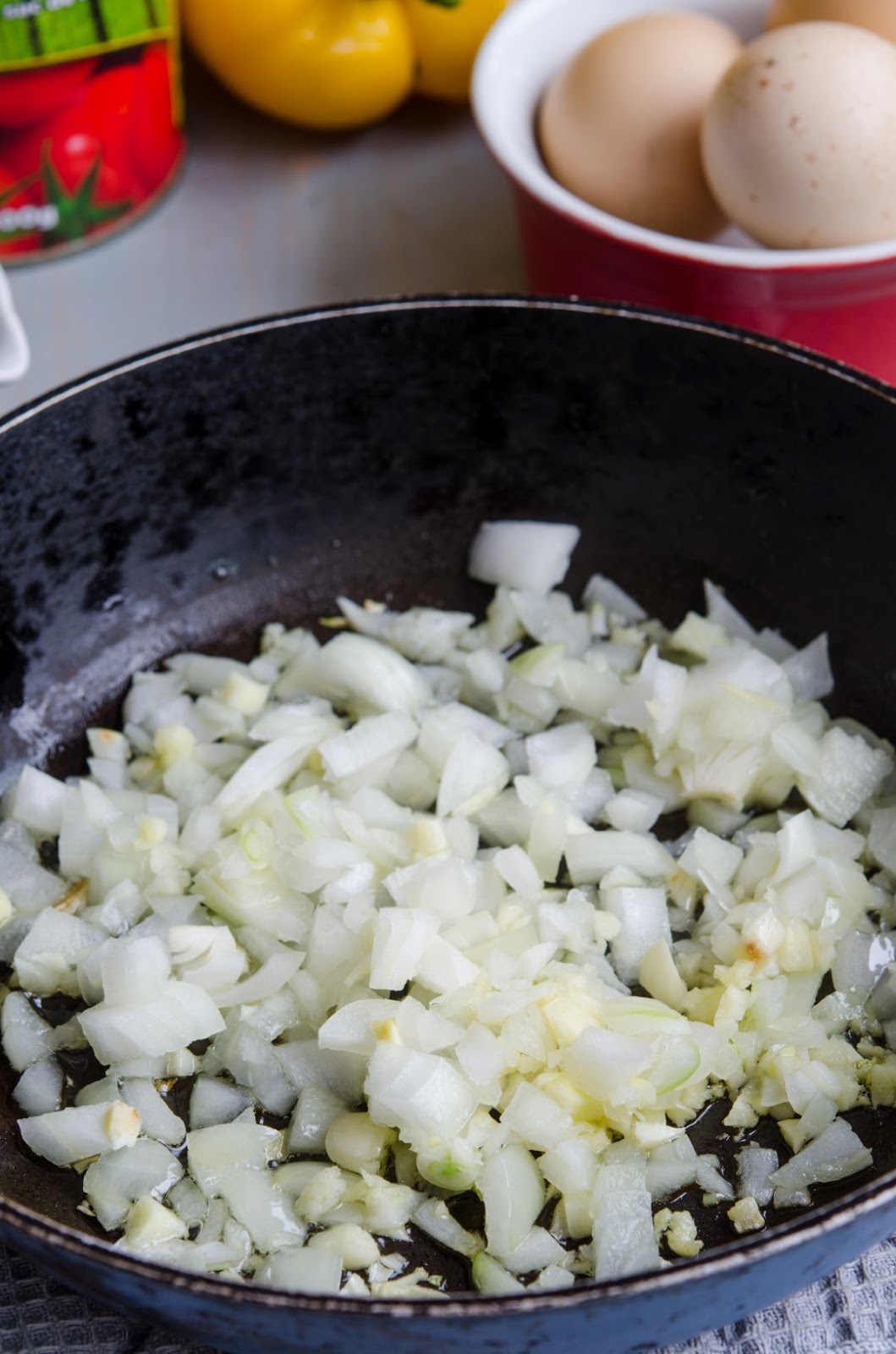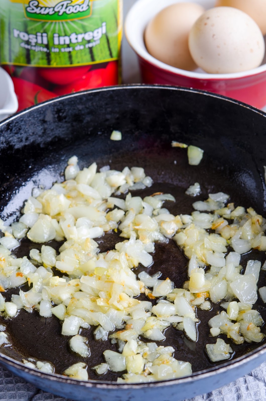 Pentru inceput tocati ceapa si usturoiul. Luati o tigaie medie sau mica si asezati-o pe foc. Incingeti uleiul de masline si adaugati ceapa si usturoiul.