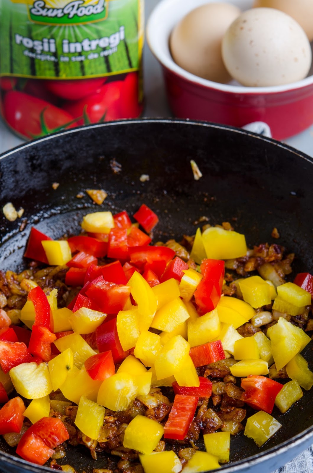 Adaugati ardeiul gras si rosu si lasati pe foc inca 2-3 minute.