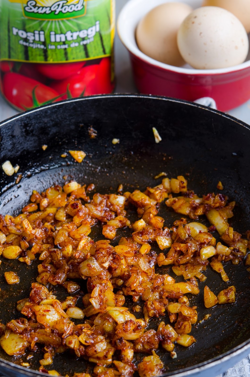 Cu ajutorul unei linguri sau a unei spatule faceti in sosul format 3 adancituri in care spargeti cate un ou. Puneti din nou capacul peste tigaie si mai lasati ouale sa se gateasca in sos pret de 7-8 minute pana ce ouale sunt gatite.