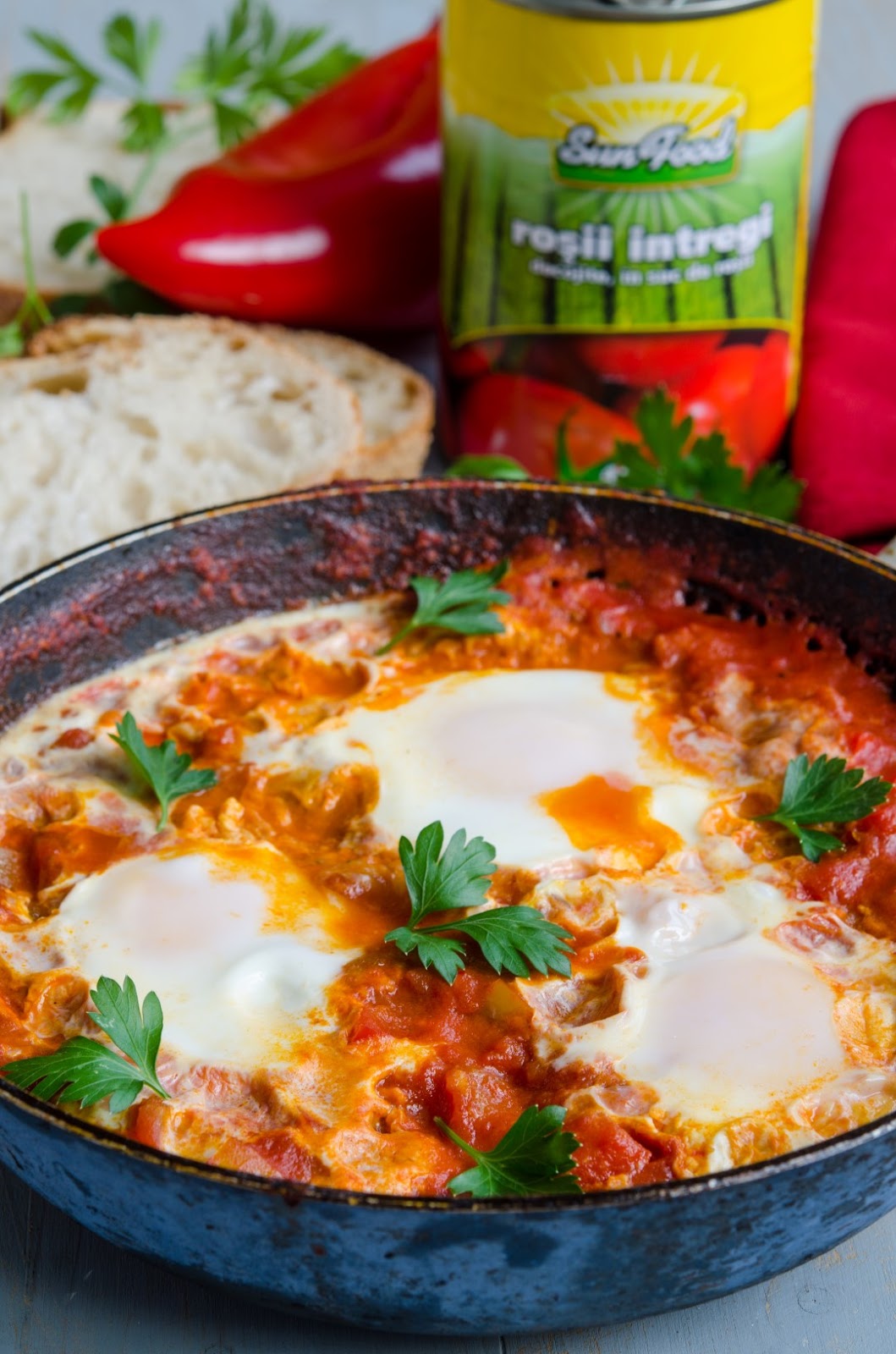 Shakshuka poate oricand reprezenta cu succes un mic dejun mai consistent, o gustare sau chiar o cina. Puteti prepara rapid un fel de mancare delicios si sa va bucurati de el alaturi de familie sau prieteni. Acest fel de mancare este foarte raspandit in Tunisia si Maroc, dar este destul de cunoscut si in Europa prin denumirea de “oua in purgatoriu”, datorita faptului ca ouale sunt gatite intr-un sos rosu si foarte picant. Sosul rosu este dat, bineinteles de catre rosii proaspete sau la conserva si reprezinta baza acestui fel de mancare. Pentru ca in piete deja au disparut rosiile romanesti de gradina, am apelat cu incredere la conserva de rosii de la SunFood, in care stiu ca mereu gasesc rosii carnoase si bune.