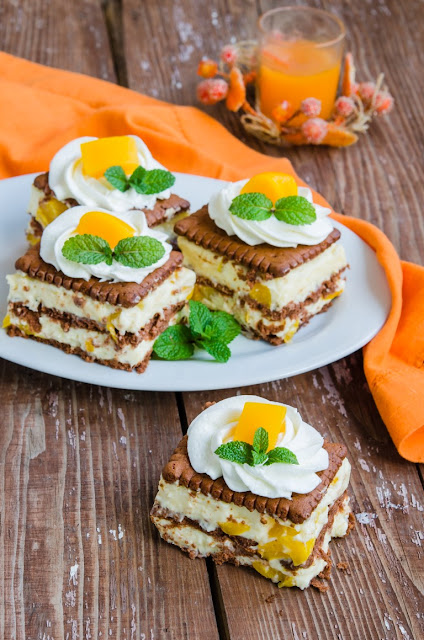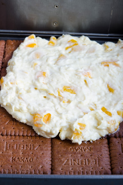 Prajitura cu piersici, biscuiti si nuca de cocos