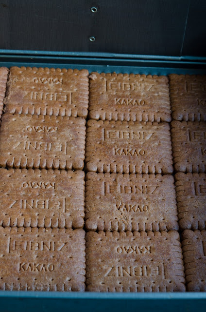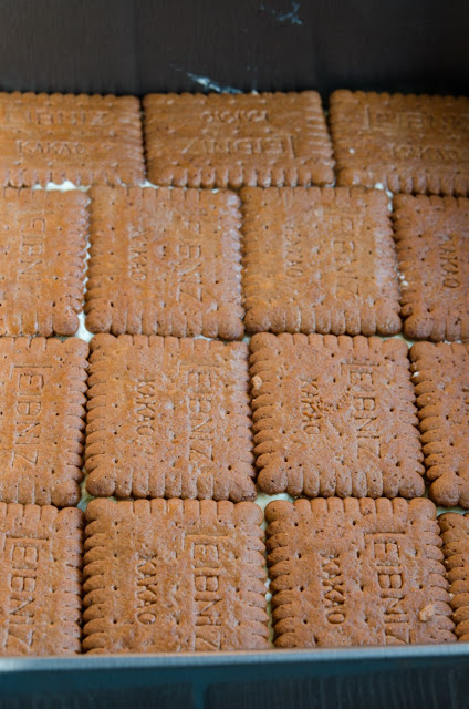 Asezati un prim strat de biscuiti intr-o tava patrata cu latura de 35 cm.