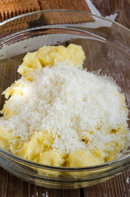 In crema racita adaugati fulgii de cocos si amestecati bine.Â