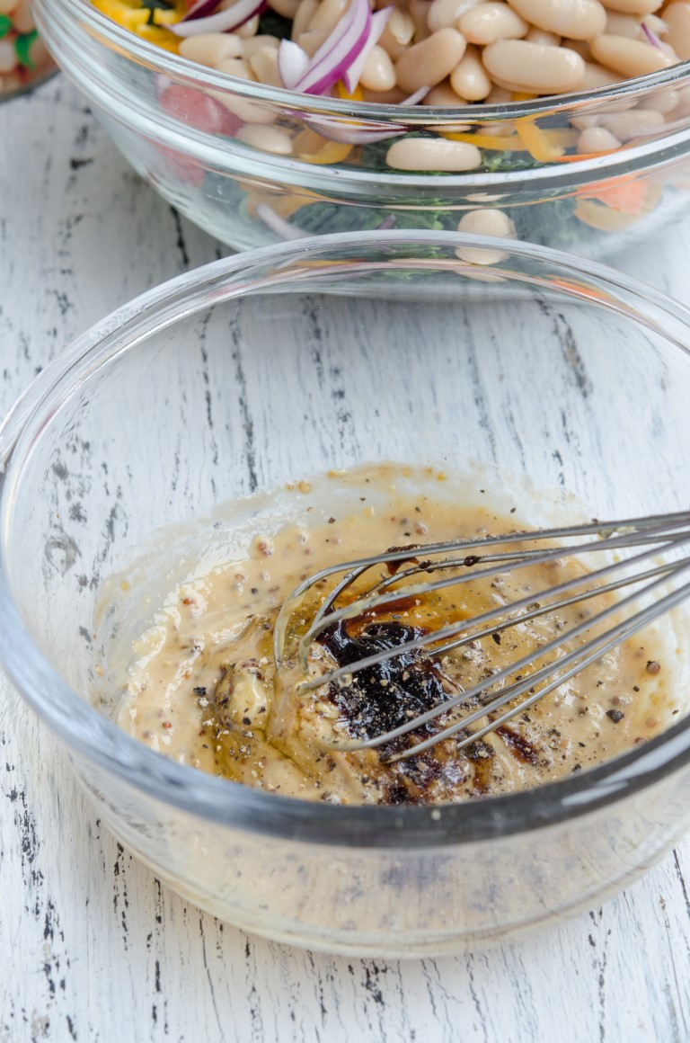 Preparati dressing-ul: intr-un bol puneti cele doua tipuri de mustar, crema de otet balsamic, mierea, sarea si piperul. Amestecati totul bine cu ajutorul unui tel.