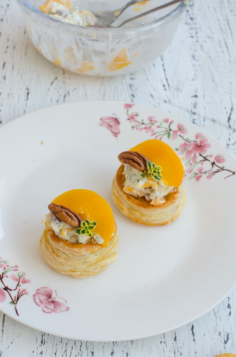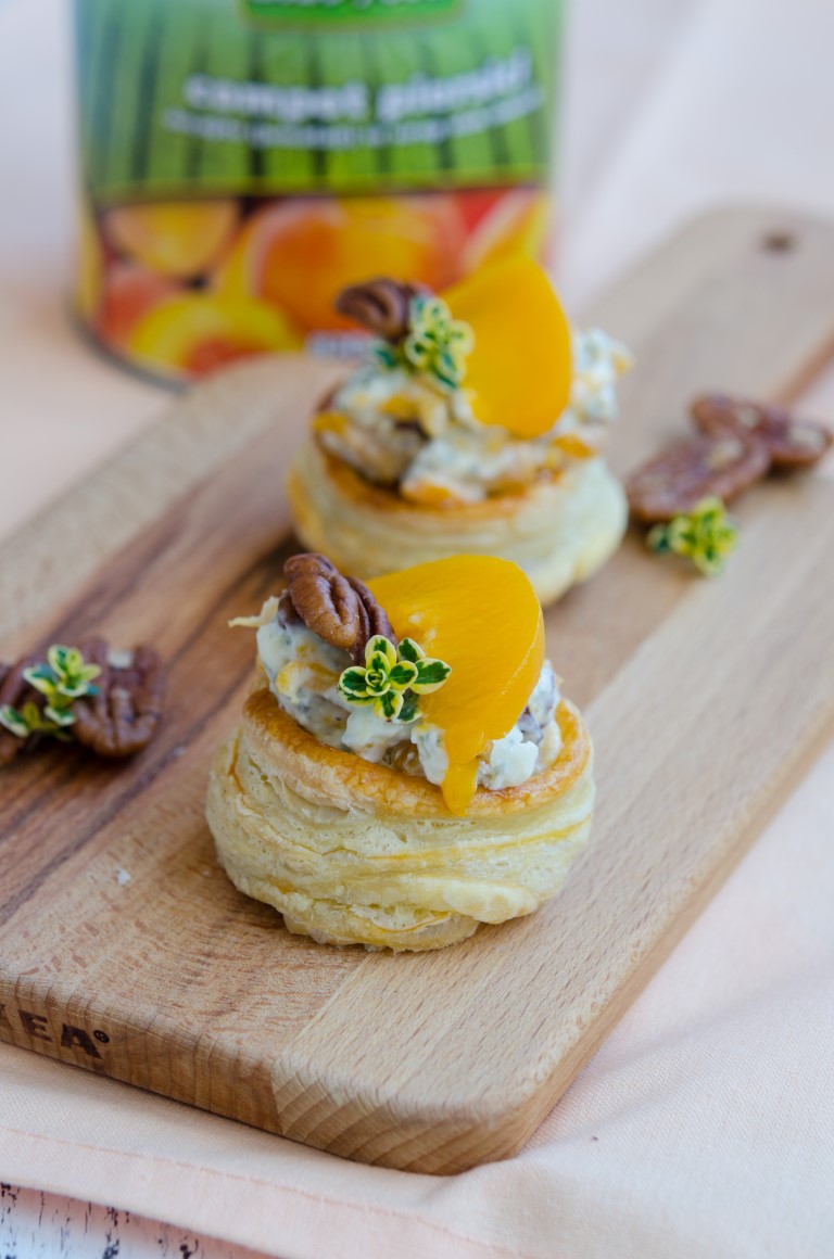 Acum ca vremea s-a mai incalzit afara, putem in sfarsi sa iesim in aer liber si sa ne bucuram de soare si de petreceri in aer liber cu cei dragi. Dar din cand in cand vremea ne mai joaca feste, asa cum a fost saptamana trecuta de am zis ca vine din nou iarna! :)). Pentru maine, pentru ca este duminica, planuiam sa mergem la un picnic in aer liber impreuna cu niste prieteni. Prognoza meteo tocmai ne-a spus ca vremea se va strica si ca vor fi sanse mari de ploaie. Chiar daca vremea de afar se strica, noi ne vom duce planul de petrecere la capat, doar ca il vom schimba un pic. Vom avea o petrecere acasa cu niste preparate usoare si rapide, de tipul finger food. Pentru ca de Paste toata lumea a mancat oua si oua umplute, de data aceasta nu mai avem de gand sa pregatim preparate asa grele ci unele mult mai usoare si mai aspectuoase. Spre exemplu aceste tartine cu piersici si branza albastra. Cosuletele se pot prepara din timp, iar cu putin inaintea petrecereii le putem pune umplutura. Sau le putem prepara cu o zi inainte si sa le servim imediat cum ajung invitatii. Referitor la umpluri, cerul este limita, puteti pune cam orice doriti, atat timp cat nu le faceti prea lichide, astfel incat sa se inmoaie cosuletele. De data aceasta eu am preparat umplutura cu branza albastra, si piersici din conserva de la Sun Food. Pentru o nota crocanta am pus si niste nuci pecan. Combinatia mi s-a parut una foarte reusita, de aceea v-o recomand si voua cu mare drag!