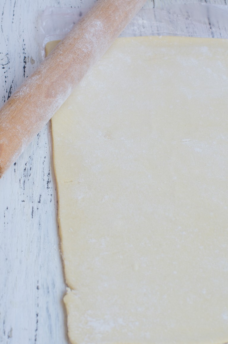Pentru inceput incingeti cuptorul la 190 grade Celsius. Pudrati cu faina blatul de lucru si asezati aluatul de foietaj. Pe deasupra presarati din nou putina faina.