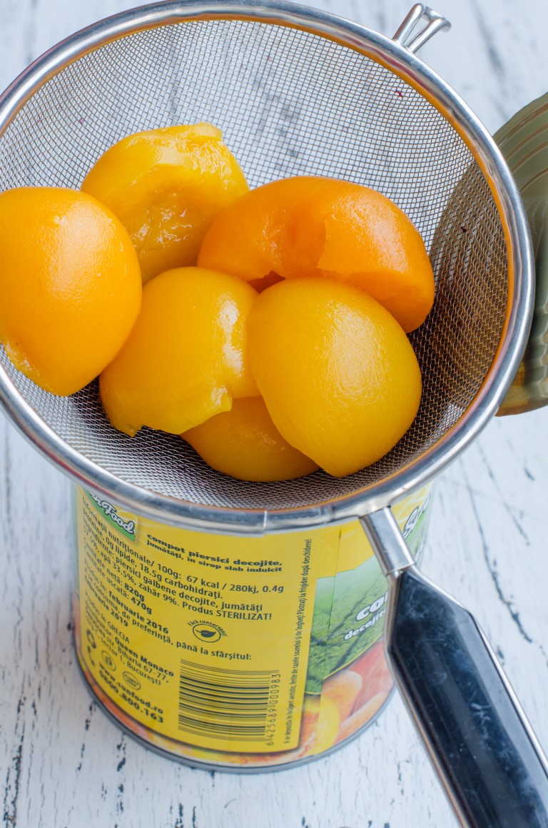 Intre timp pregatiti umplutura. Desfaceti conserva de piersici, scoateti piersicile intr-o sita si scurgeti-le bine.