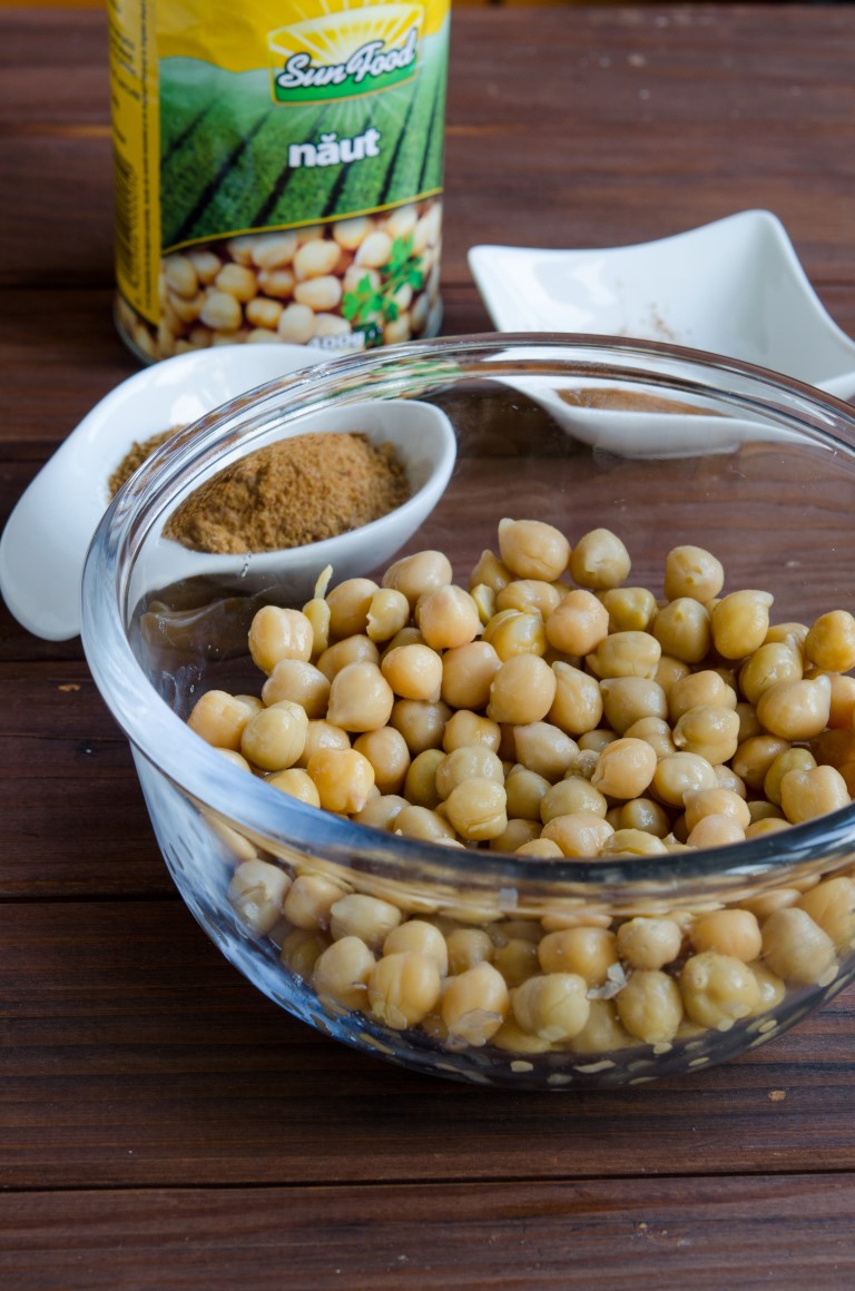 Pentru inceput incingeti cuptorul la 180 grade Celsius. Desfaceti conserva de naut clatiti nautul sub un jet de apa, puneti nautul pe un prosop curat de bucatarie si uscati bine nautul.