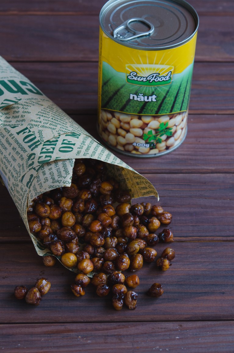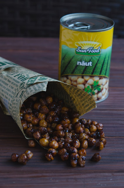 Un snack delicios si mai sanatos decat cele pe care le gasim prin magazine in zilele noastre este acest naut crocant caramelizat cu miere si condiment 5 arome. Da, pentru mine snack-urile pot fi atat dulci, cat si sarate. Varianta sarata a nautului crocant am mai pregatit-o si la vinete la cuptor cu naut crocant. Varianta dulce este una chiar spectaculoasa, mai ales ca nautul este mai rar asociat cu un preparat dulce. Pentru o aroma speciala, eu am optat pentru condimentul chinezesc 5 arome sau 5 spice. Acest condiment contine: piper Sichuan, cassia (un tip de scortisoara, denumit si scortisor), cuisoare, fenicul si anason stelat. Toate aceste 5 condimente formeaza un tot unitar si dau nastere unui condiment minunat cu gust special. Nu va temeti sa folositi 5 spice si in alte preparate cu carne precum pui, porc sau peste. Cat despre naut, am folosit, bineinteles, nautul de la Sun Food.