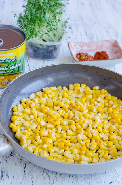 In aceeasi tigaie incingeti o lingurita ulei de masline si puneti porumbul. Sotati cateva minute pana ce capata o culoare placuta.